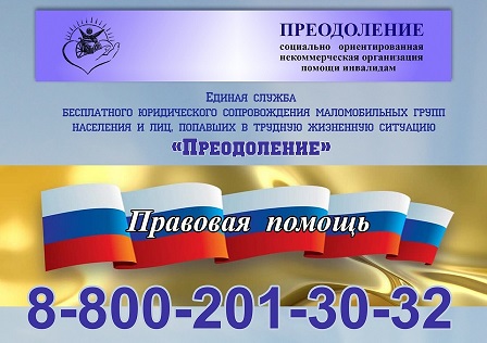 Единая служба юридического сопровождения маломобильных групп населения и лиц, попавших в трудную жизненную ситуацию «Преодоление» принимает обращения по бесплатному телефону 8-800-201-30-32 и по электронному адресу 88002013032@yandex.ru