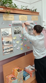 Учащиеся 5-9-11 классов создали коллаж с изображением бабочек, которые символизируют безвинно загубленные души умерших детей, стремящихся к небесам из огня.
